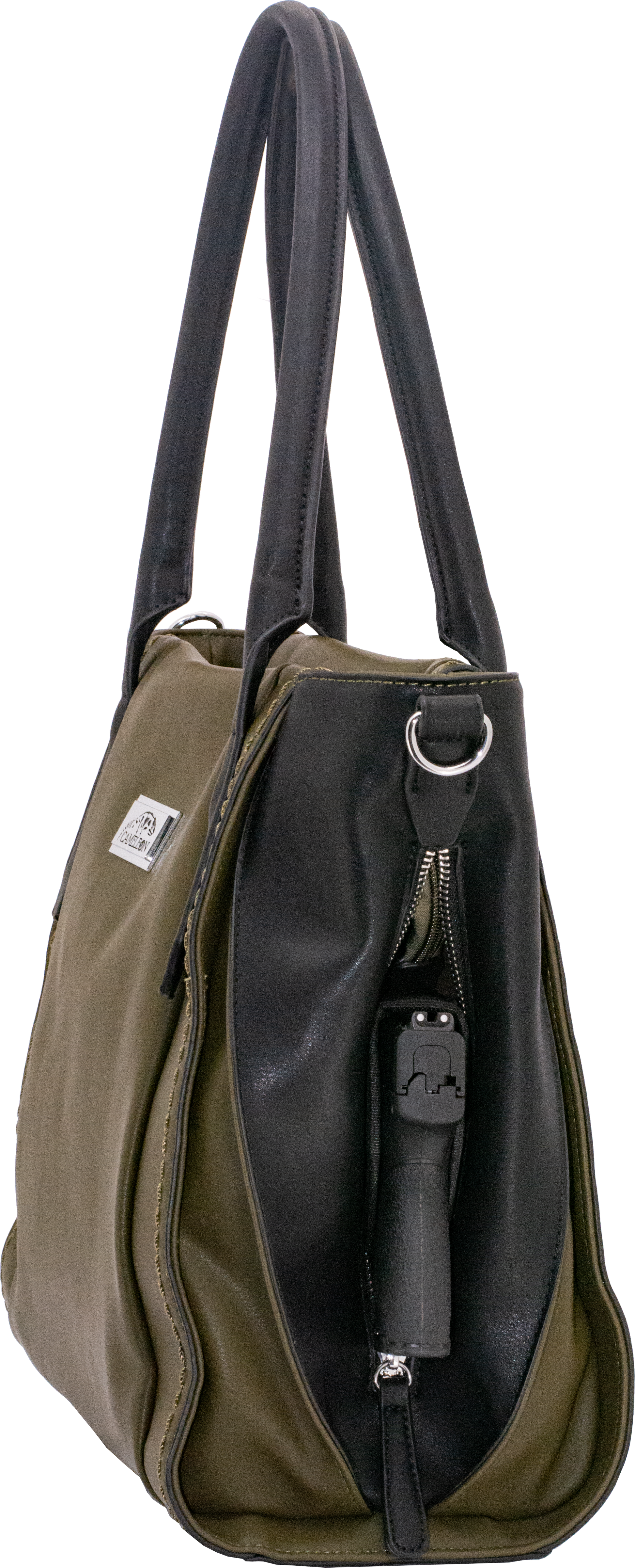 One Large Zipper Compartment with 2 open phone pockets on one size and 1 zipper pocket on the other. Reinforced Bottom with 4 metal feet. Removable and Adjustable cut resistant Crossbody strap.