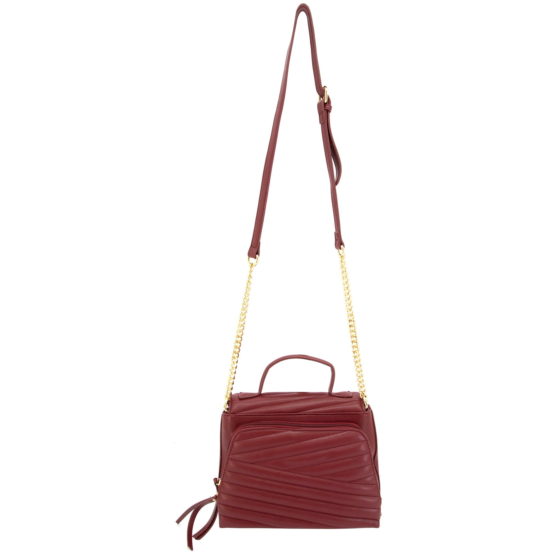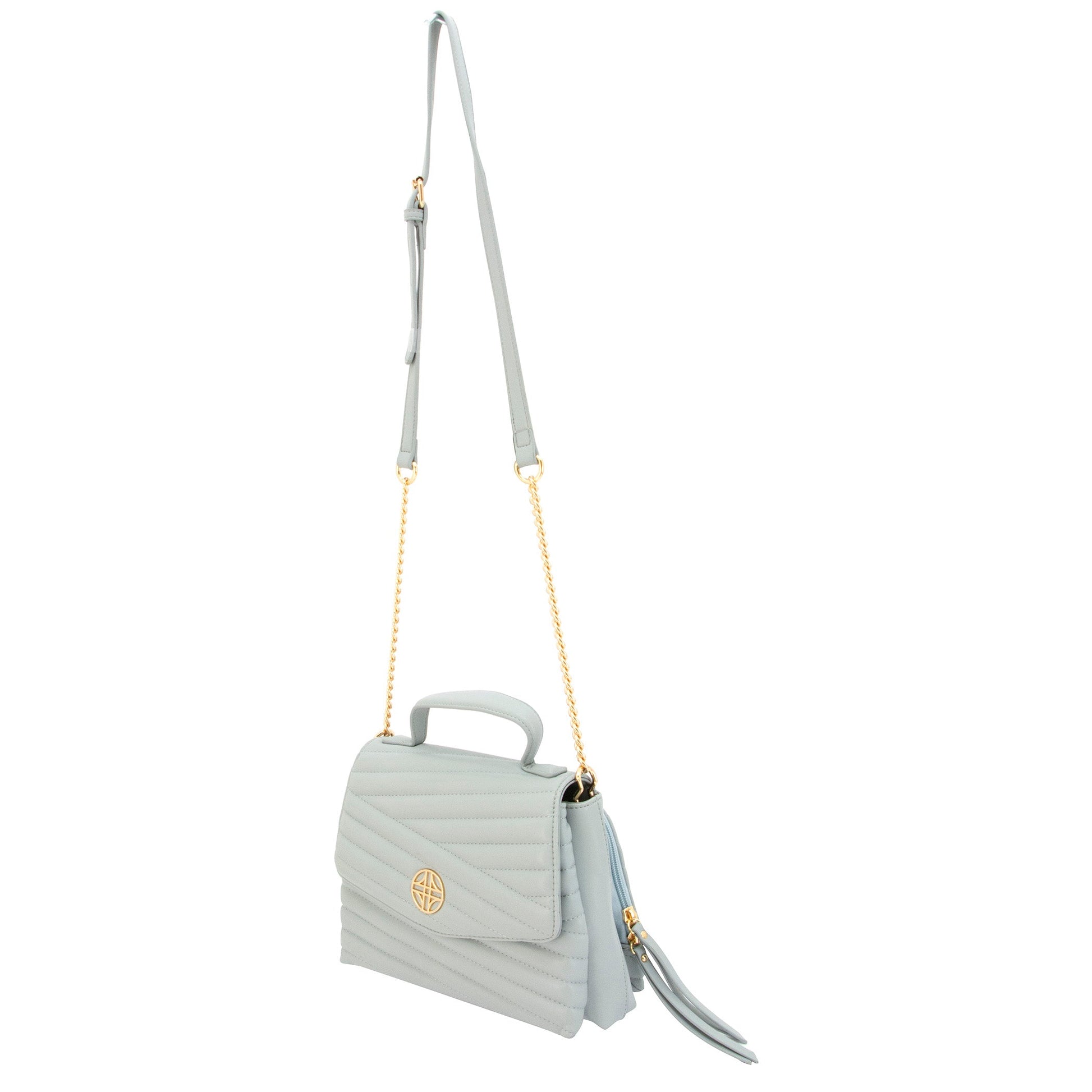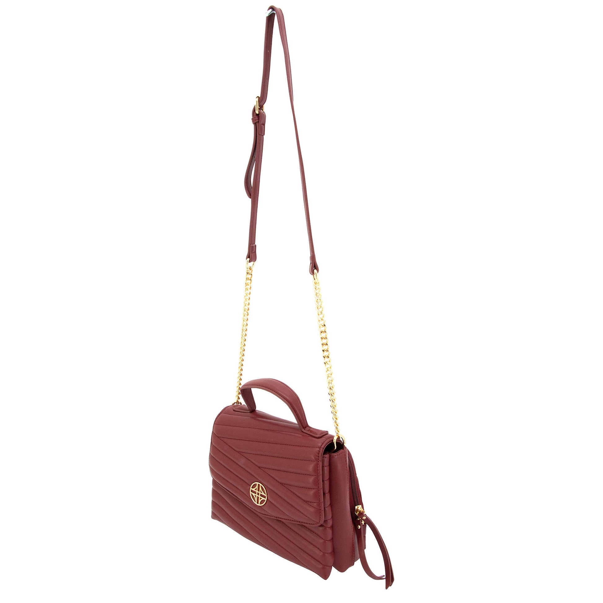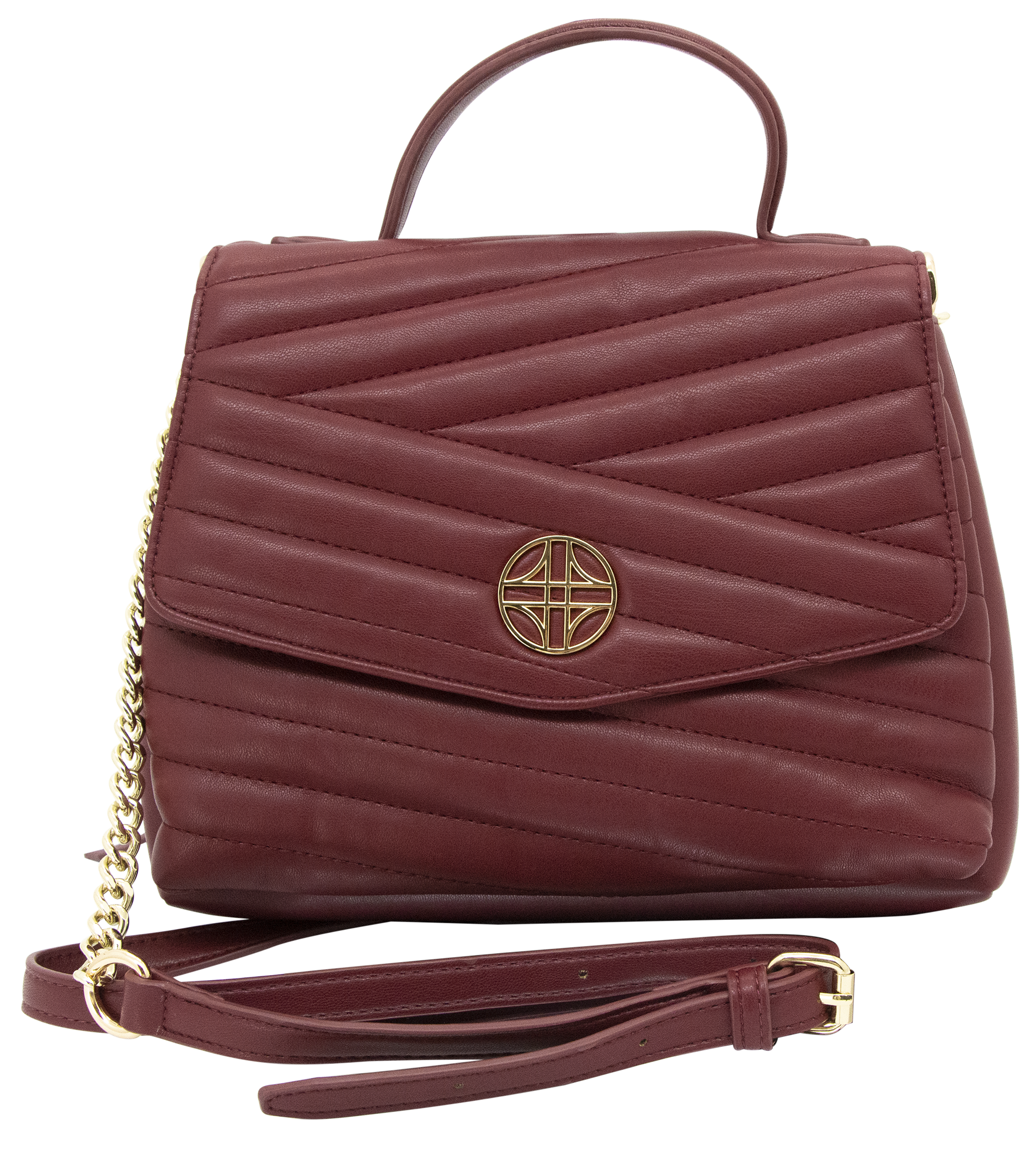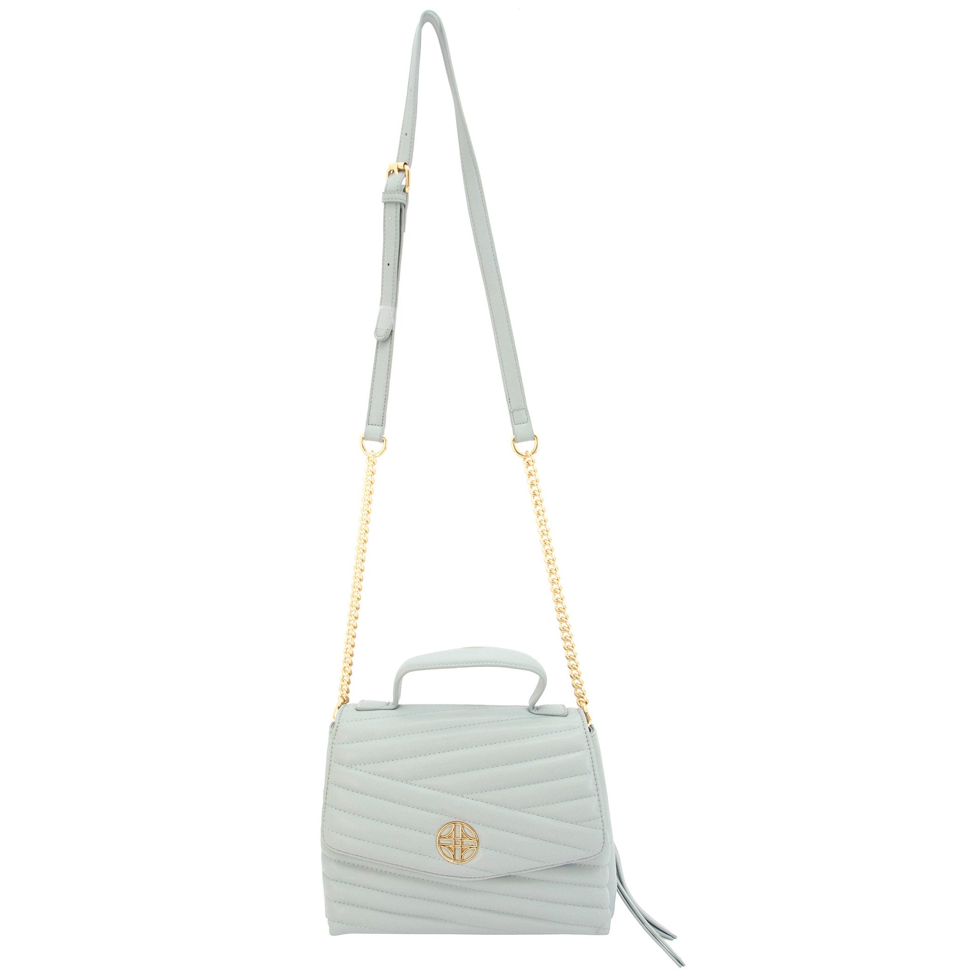 Venus is vegan leather, quilted handbag with a half flap front, hidden magnetic snap closure, and delicate gold medallion detail. It features both a vegan leather handled, a curb chain strap, and a structured top handle.