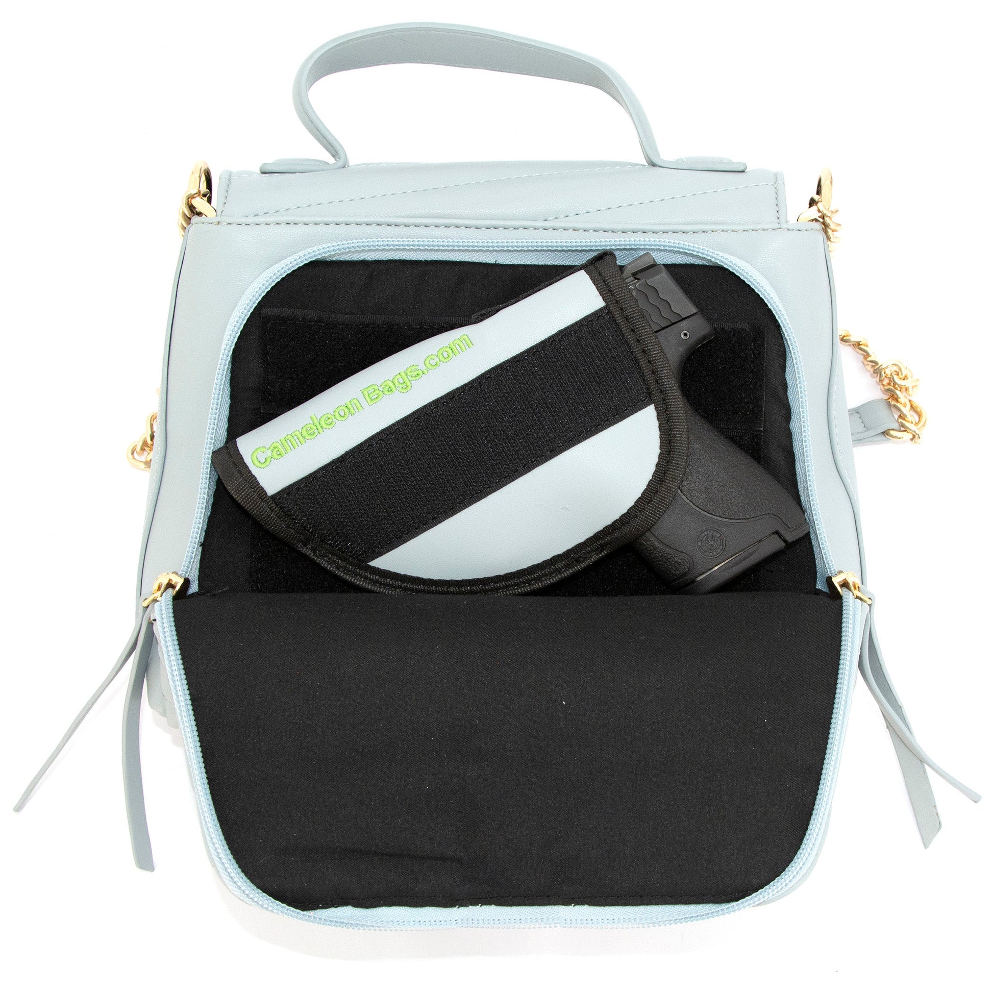 The Cameleon Venus gives you everything you need in a compact personal protection purse. The compact size allows you to minimize what you carry, while still allowing you to stay prepared. We have included the Cameleon Tail to hold your Pepper Spray or Mace and each bag comes with a secure holster for your firearm.